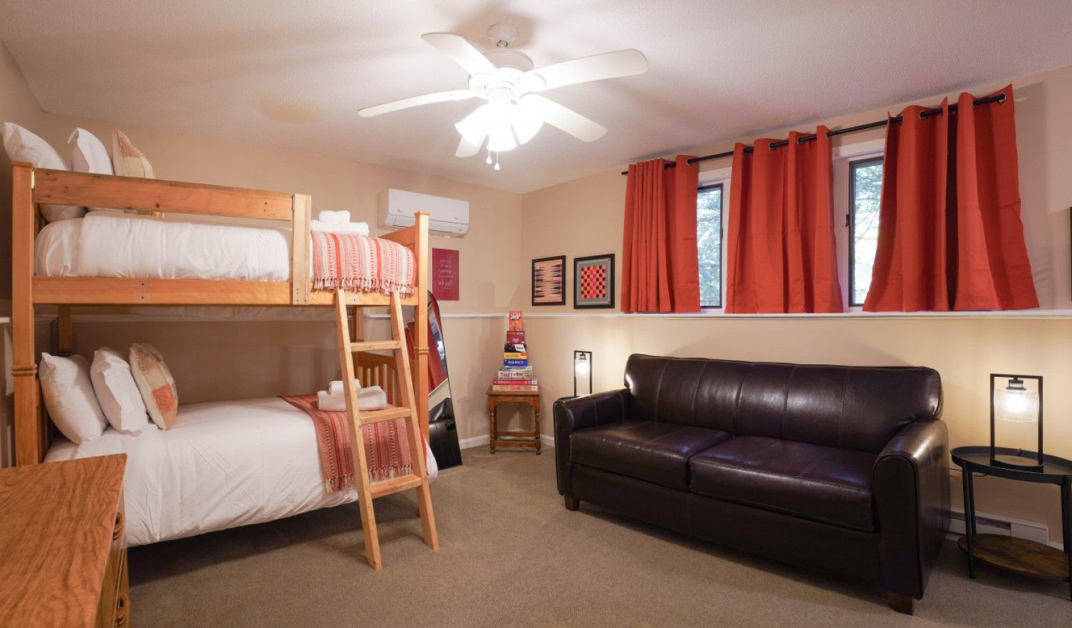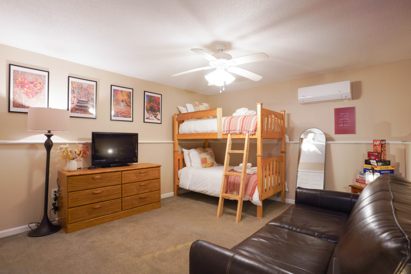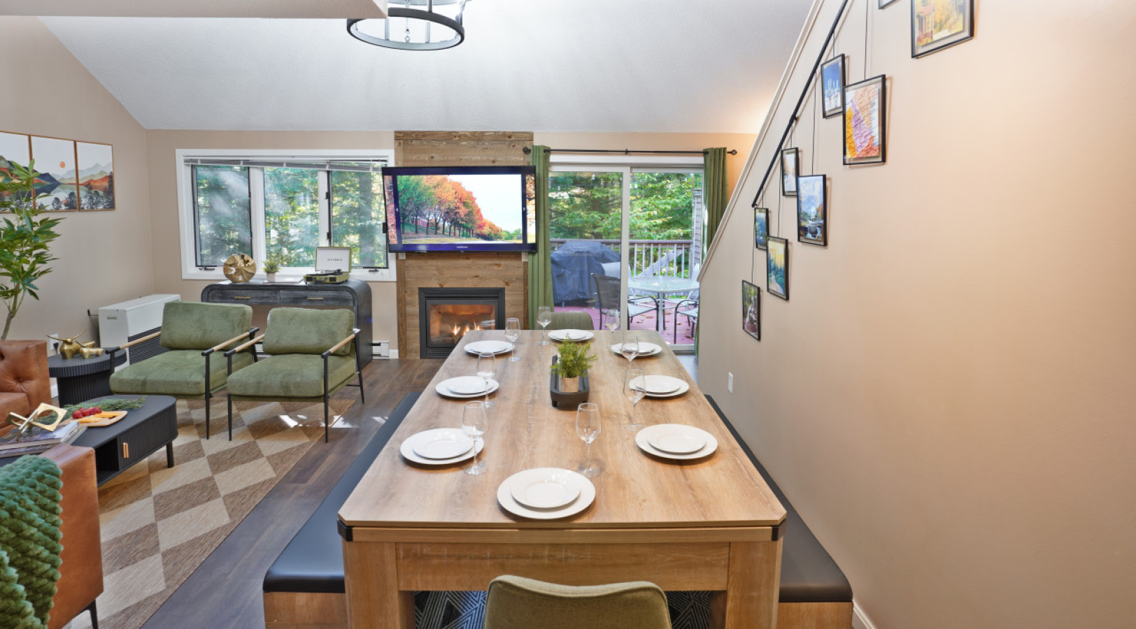 / nightWelcome to Cranmore Hideaway — a cozy, newly designed 3-bedroom, 2-bath townhome tucked away in the heart of North Conway. Surrounded by peaceful forest views, this charming retreat offers the perfect blend of rustic character and modern comfort, ideal for families, couples, or small groups year-round. Whether you're visiting for a snowy ski getaway, a vibrant fall foliage tour, a summer hiking adventure, or a springtime escape, you'll find comfort and inspiration here. Just 5 minutes from Cranmore Mountain Resort and close to downtown's shops, restaurants, and attractions, the location is perfect for exploring everything the White Mountains have to offer. After a day of adventure or relaxation, return to your private deck and unwind in the fresh mountain air. Cranmore Hideaway is your four-season sanctuary — book your stay today and make lasting memories in every season. DESCRIPTION: This 3-level townhome features 3 bedrooms, 2 bath, a cozy little retreat for your group to enjoy the white mountain area. We have sleeping arrangements for 8 guests. Main Level: The main level features an open-concept kitchen and living area with soaring vaulted ceilings and gorgeous wagon wheel chandelier. The living room boasts a wood-accented gas fireplace, creating a perfect spot to relax after a day on the slopes. This level also includes a bedroom (queen) and bathroom, along with a cozy coffee bar stocked with local brews for your enjoyment. Upper Level: The entire upper level is a large primary bedroom (king) suite with a bathroom, a standing shower and a separate soaking tub for apres-ski relaxation. Lower Level: It includes bunk beds (twin over twin) and a full sofa bed, offering additional sleeping space. This area can also serve as a second living room, perfect for playing games or watching TV. Amenities includes fully stocked kitchen, furnished bedrooms, smart TV (in the living room and all bedrooms), central heating, split ACs in all rooms and an exclusive access to the community's tennis court and playground. DINING AREA + GAME SPACE: We have a lovely dining nook (seats 8) where you can enjoy a relaxed meal or enjoy board games with your family and friends. The nook includes billiards, table tennis, and a dining table with dual storage bench seating (all in one). Challenge your companions to various games for a laid-back evening indoors. PARKING: House comes with 2 car dedicated parking spots (right outside the house) KITCHEN + COFFEE BAR When it's time to refuel, the fully equipped kitchen provides everything you need to whip up delicious meals and snacks. Enjoy your culinary creations at the dining table. Our coffee station provides a variety of local brews and teas. OUTDOOR: Step right outside from the main living area to a charming porch, perfect for summer dining or enjoying a BBQ grill session. Please note: A $1,000 refundable deposit will be charged to your credit card to cover any potential damages ABOUT THE LOCATION: After a day of outdoor fun, come home to unwind by the cozy gas fireplace. Whether you're here for skiing, hiking, or simply soaking in the serene surroundings, this condo is the perfect base for your Conway adventures. Book now for a memorable mountain escape! ADDITIONAL: We do have video surveillance of the front door, parking and backyard which helps us in maintaining the property from a distance. The video is motion activated, but can be checked at any time by the hosts via live feed. Any attempt at disabling or obscuring the cameras is prohibited. PETS: - Up to 2 pets allowed ($100 fee per stay). Approval needed for more, with extra fees. - Keep pets leashed while walking in the neighborhood. - No unattended pets - No pets on furniture (sofas, beds, etc). - Clean up after them inside and outside - Prevent excessive barking or noise. While $100 pet fee covers extra cleaning, but additional charges apply for uncollected pet waste, soiled linens, or damaged furniture. Thanks for keeping our space pet-friendly for all! SMOKING/DRUGS POLICY This is no smoking and no drug use house. Use of such is strictly prohibited inside or outside on premises. $500 fee for evidence of smoking or drug use plus additional cleaning fees apply. The nightly rates are reflective of minimum guest booking with no pets. We request you to add the exact count of guests, children and pets at the time of reservation for the nightly rates to be accurately reflected for any additional charges.