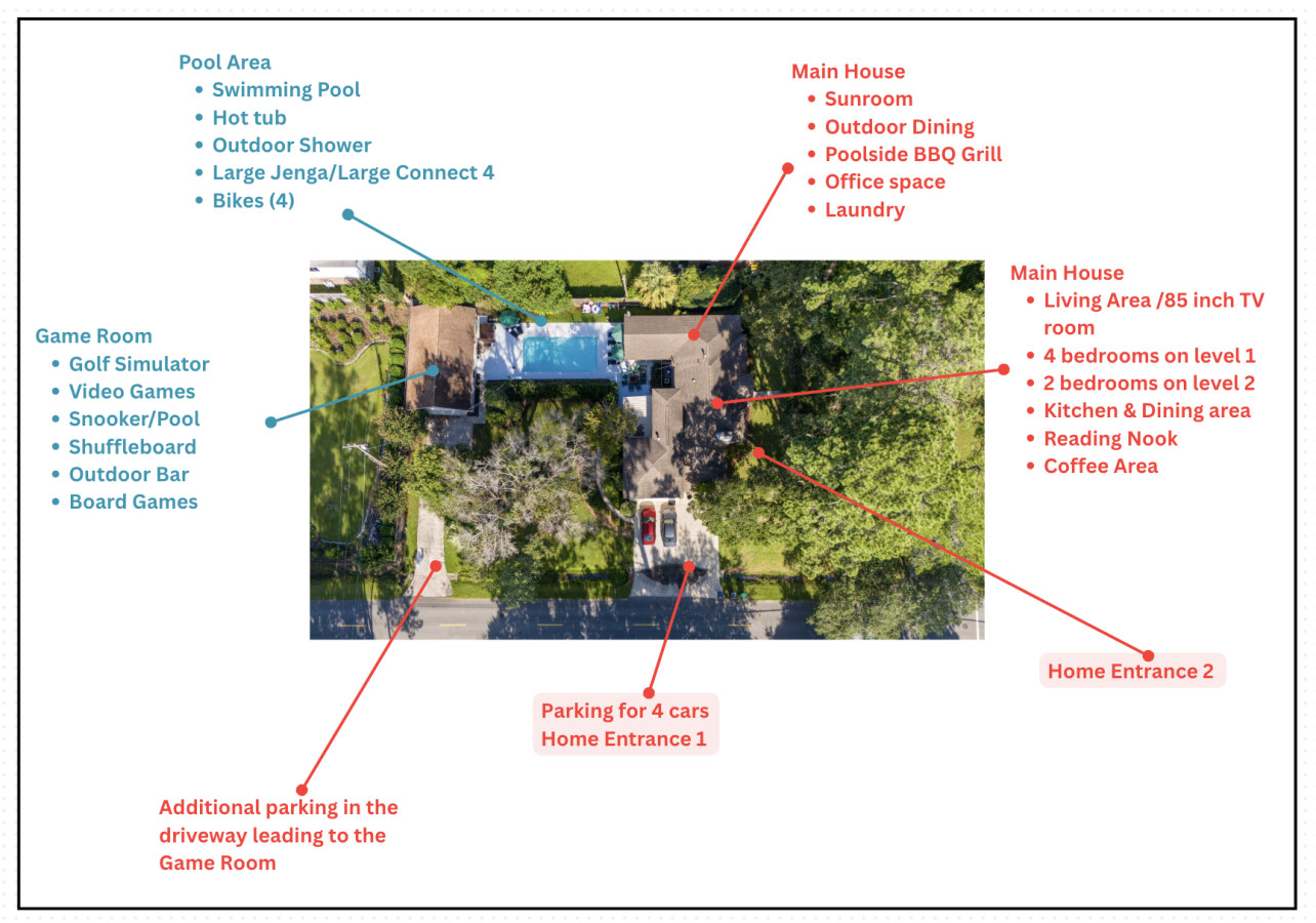 August 2025 5.00Our stay was amazing! We had a great time and it was perfect for our large group of 11. The host was very responsive when we had issues with the code on the game room door and did everything to help us get in. The floors were a little dirty with dog hair from I’m assuming what was the stay before us so we did have to wear shoes in the house but the rest was clean. But the pool is amazing! The game room exceeded all of our expectations as well. When our beach day got cancelled because of rain, we had so many other options to entertain us because of the game room amenities. It was also a blessing in disguise to be somewhat out of the city so we had more privacy with our group and downtown was a quick 15 minute drive. We would definitely stay there again!!